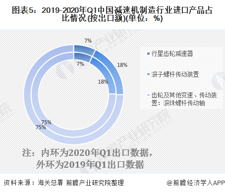 從進(jìn)口產(chǎn)品結(jié)構(gòu)來看,近年來我國減速機(jī)制造行業(yè)進(jìn)口產(chǎn)品份額變動(dòng)不大,2017-2020年Q1各產(chǎn)品進(jìn)口額變化情況與行業(yè)整體進(jìn)口額變化情況近似。2020年第一季度,共進(jìn)口“齒輪及其他變速、傳動(dòng)裝置:滾珠螺桿傳動(dòng)軸”2.59萬美元,占2020年第一季度行業(yè)總進(jìn)口額的75%;“行星齒輪減速器”和“滾子螺桿傳動(dòng)裝置”分別進(jìn)口0.25萬美元和0.60萬美元,占行業(yè)總進(jìn)口額的7%和18%。