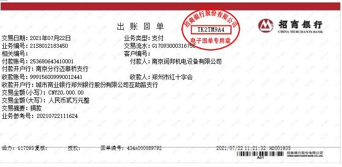 災難面前,全國上下風雨同行,同舟共濟。7月22日,潤邦公司決定盡我們的綿薄之力馳援河南,通過鄭州市紅十字會捐款人民幣兩萬元整,用于保障受災地區(qū)人民群眾的生命安全、緊急救災物資采購等,助力鄭州市防汛救災工作。